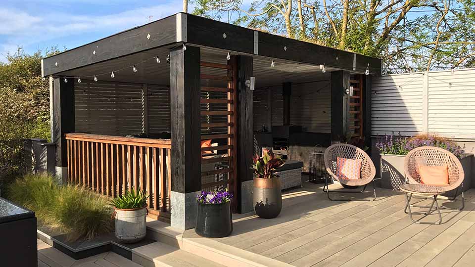 A bespoke built sedum roof gazebo to create the ultimate outdoor living room/entertainment area As part of a full garden design project with planting areas, water feature, slate paving design, decking area & courtyard.