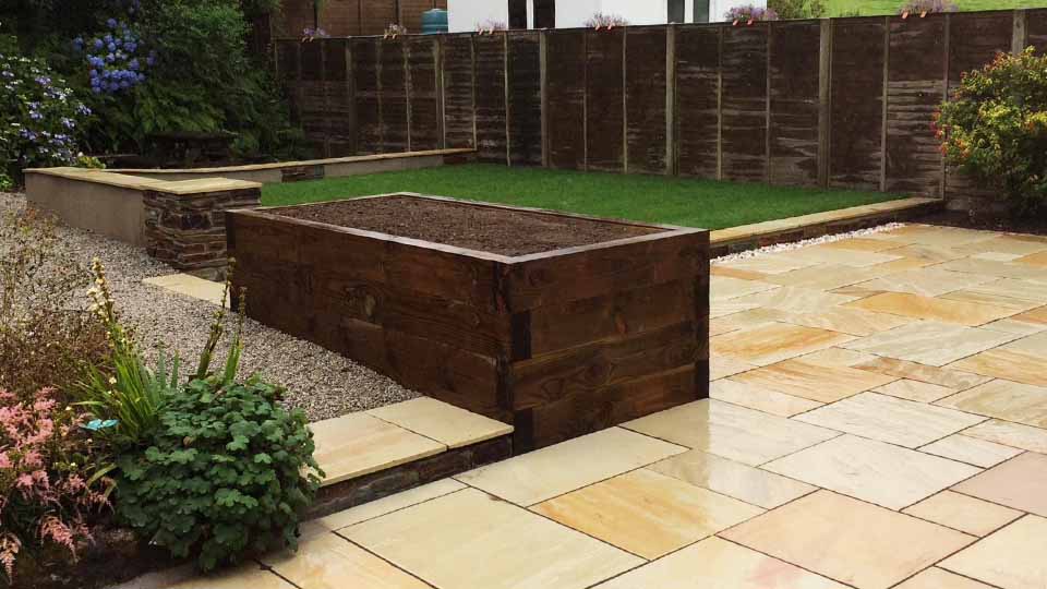 A new patio dining area created using Indian sandstone paving with a fresh new lawn and dividing feature wall.