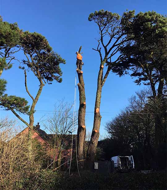 Removing an unwanted pine tree to expose more sunlight. Involving rigging procedures to safely dismantle around phone cables and a busy bridleway